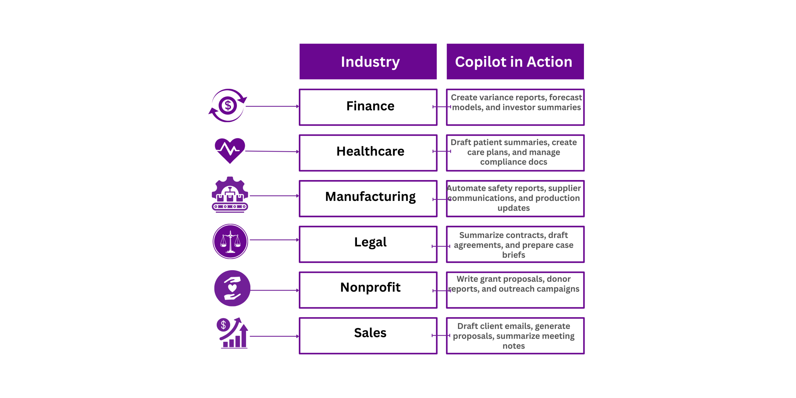 | Healthcare | Draft patient summaries, create care plans, and manage compliance docs |